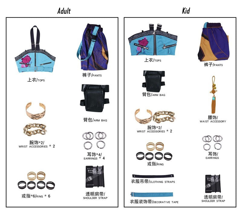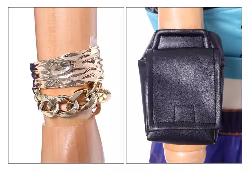 - Package : 1 Set (Top/Pants/Arm Bag/Wrist Accessories/Shoulder Strap/Earrings x 4/Rings x 6)
